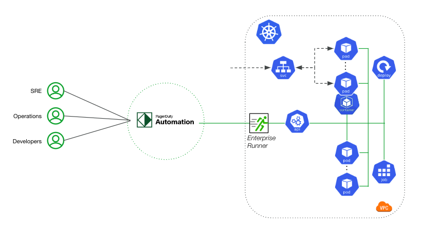 PagerDuty Automation handles app and service scaling by automating the deployment and scaling of applications in Kubernetes clusters, ensuring efficient resource allocation. It streamlines HITL approvals by managing approval tasks for specific services or thresholds, adding oversight where necessary. PagerDuty integrates with systems of record to automate ticket creation and resolution related to changes, ensuring accurate tracking and faster response times.