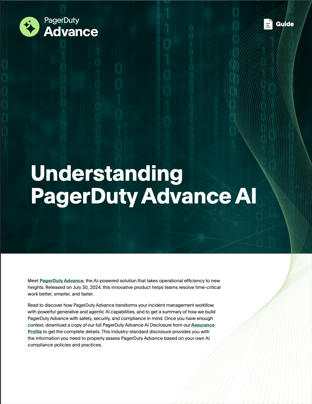 Meet PagerDuty Advance, an AI-powered solution that helps teams resolve critical work better, smarter, and faster while keeping humans in control. With this guide, you’ll understand how our generative and agentic AI capabilities can transform your incident management while providing the reliability and control your organization demands. Get the guide and learn about: